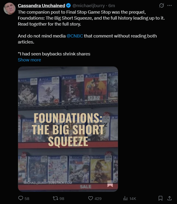 >Short squeezes are out of the equation in my opinion, Michael Burry>No, you don’t understand. He’s just saying that to cover his own ass for legal reasons. Read between the lines!, RedditSo, is the one thing we all expected to happen and invested our money in not going to happen, or are we just coping at this point?