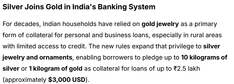 The Change: Previously, Indian banks mostly only accepted gold as collateral for small personal/business loans. Starting in April 2026, they are officially allowed to accept silver jewelry and ornaments as well.