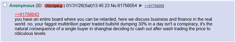 >>61755962never want to hear another silver/gold bug talk shit about crypto ever again after getting pump and dumped like a shitcoin I hope it was an enlightening situation for them
