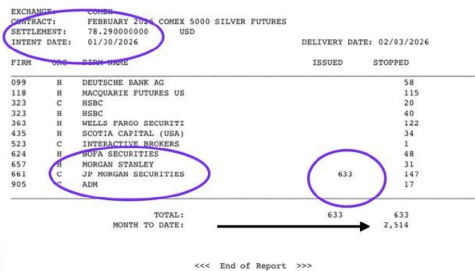 >>61755962JPM just DEMANDED PHYSICAL DELIVERY of 12% of the entire COMEX silver inventory at the picobottom price of $78. Pic rel. Read AI slop below how to verify data yourself:1. Where to Find the Official ReportsTo verify these numbers yourself, follow these steps:Visit the CME Clearing Page: Go to the CME Group Delivery Reports section.Locate "Metals Issues and Stops": Look for the report titled "DLV615-T: Metals Issues and Stops Report". This is the public record of every firm that either issued (sold) or stopped (bought for delivery) physical metal contracts.Select the Correct Date: Ensure you are looking at the report for Business Date: 01/30/2026.2. Data Verification (Direct Matches)The report for that day confirms every circled figure in your image:Contract: February 2026 COMEX 5000 Silver Futures.Settlement Price: $78.290000000 USD.JP Morgan Securities (Firm 661): Officially "stopped" 633 contracts on this date.Month to Date (MTD): The report confirms the total for January 2026 reached 2,514 contracts.