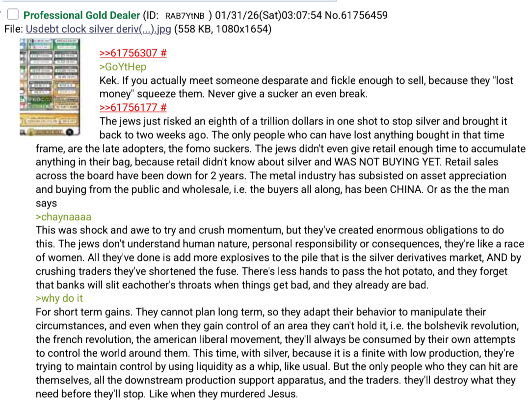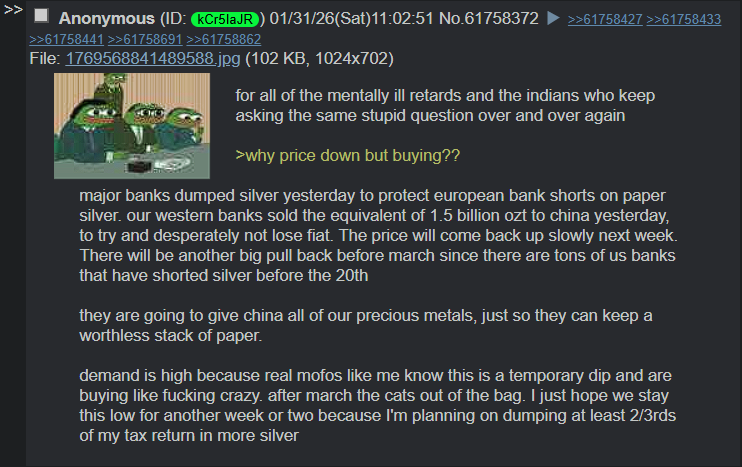 >>61758851Banks are flailing just to stay afloat. The price action here did nothing to fix anything and the price will be going higher in the long term. Even if the banks try to spoof the price downwards a bit more, this is nothing more than a buying opportunity for everyone who was frantically showing up to buy at $110+.The entire thesis around silver is that the real-world supply is what matters and the market is suppressed via silver proxies. There is nothing to worry about unless you are stupid enough to be involved in some sort of leveraged silver investment. History has already shown us what happened to the Hunt brothers who invested in silver futures. They just turned the buy-button off so they ONLY thing you could do is sell. Naturally the price can only go down when they do that. The trick has always been to get your hands on as much as you can and still responsibly manage your life's financial needs. The banks flailing is meaningless when I am not exposed to their credit. They will have to capitulate at some point, otherwise the vaults run dry and all the silver in the world will flow into China's hands.