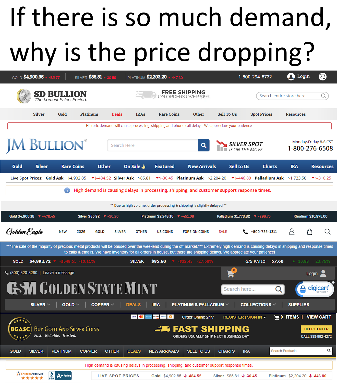 >>61758261one thing, the price manipulation effort continuessecond thing, refiners and everything upstream of refiners, are log jammed. they can only process so much, so fast.two major US refiners just announced they were not taking any more metal for a time.this means for many dealers (LCSs) alot of their inventory they bought form retail seller is log jammed. and they're tapped out financially until they can move/sell product.it's pretty simple really