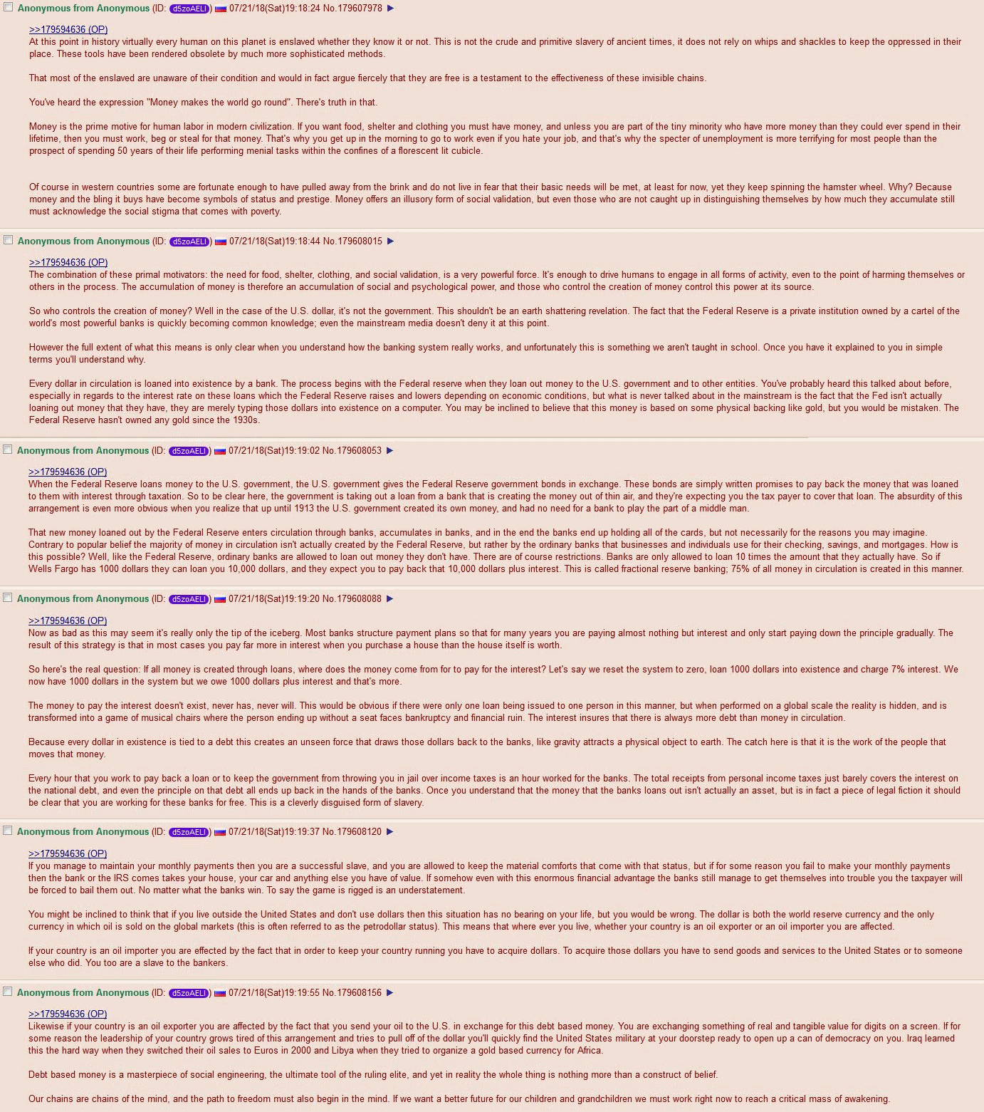 >>61760811All paper currency is created when it's loaned out into existence and it's destroyed when the debt is paid back.The fact interest is additionally charged when it's created means the debt cannot even be paid off because the debt is always going to be higher than the currency that exists.The system must always have someone take in new debt in order to propagate. Otherwise, it results in a deflationary spiral. A deflationary spiral affects them too, but they can always print for themselves so they stay afloat while you are drowning in debt and never be able to pay it back, unless you go bankrupt and hand over all real assets.The system is stable at the beginning because it promises a 1:1 backing with physical precious metals when is then broken.