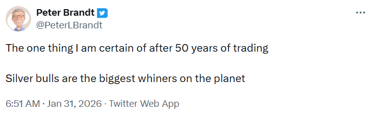 >>61759945>What prompted this? What type of "whining" is he talking about?He sounds like he is projecting. OG stackers are actually happy for the crash because it shakes out the FOMOs and gives us another buying opportunity. None of the fundamentals have changed.We are still up 19% month over month. The gold and silver futures market was EXPLICITLY intended to create face ripping volatility, precisely to wipe out any leveraged traders, and chase out anyone who needs conservative consistent returns.The market on Friday, did exactly what it was designed to do.