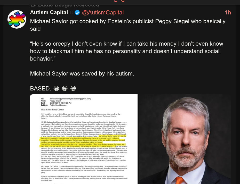 Michael Saylor was too weird, even for Epstein.https://x.com/AutismCapital/status/2017656615277891604