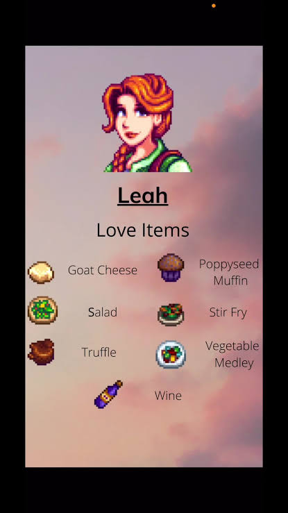 >>61776868>>goat cheeseBased. I used to give Leah a lot of goat cheese as gifts because it's one of her favorite items and you get extra hearts towards marriable with her