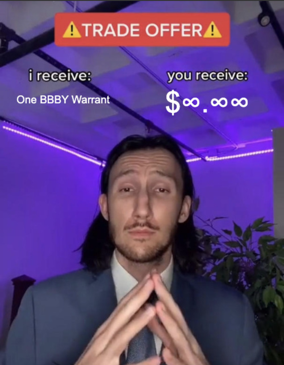 >>61813992It's gonna be a warrant M&A with BBBY & GME. The warrants force the shorties to close. Kansas City Shuffle.