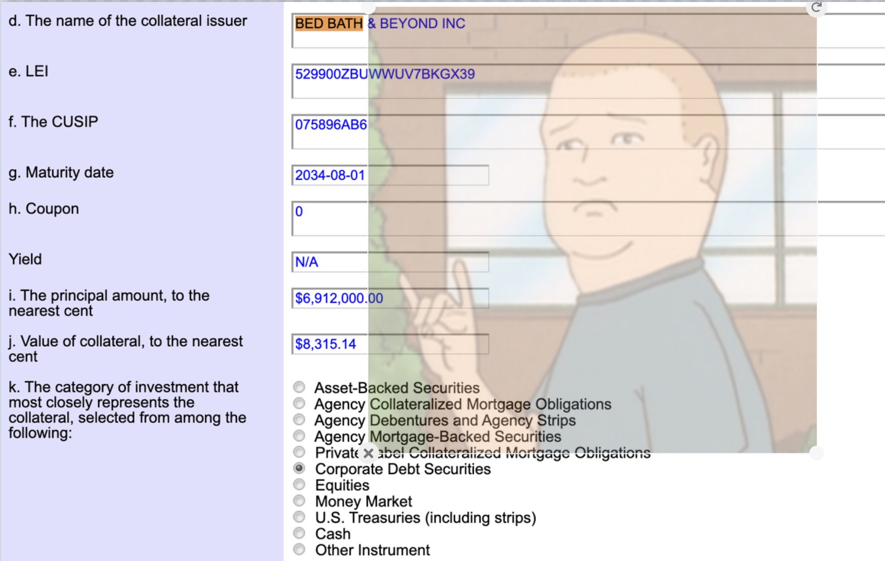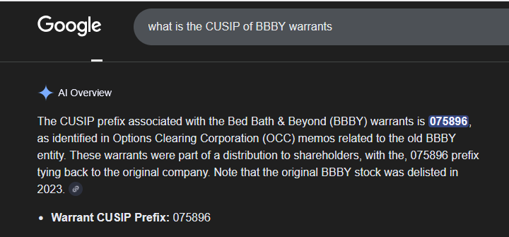 >>61827395The CUSIP conundrum has been solved, and it's a verified FACT that BBBYW is not related to BBBYQ. Marcus has confirmed this and is destroying lying grifters on X.