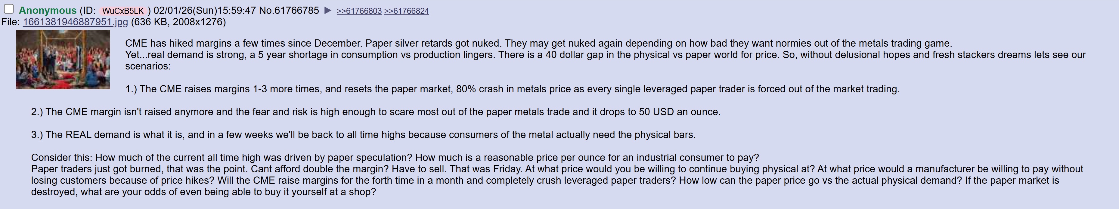 >>61805030>when it ceases to be a provider for the actual commodity they sellAccording to your own narrative no one ever stood for delivery in comex before now so why does it even matter if their vaults are empty and they can't deliver?The people who actually need silver are going directly to minors and buying it for way under the paper price.