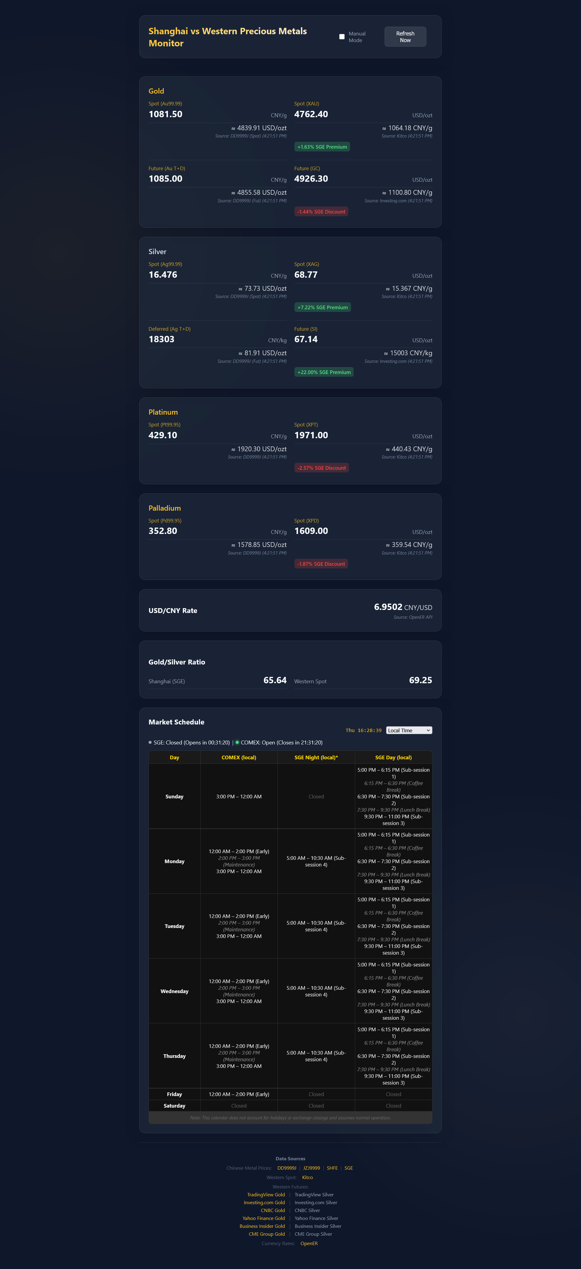 I've been vibecoding a tool to do the Shanghai vs West price conversions through an HTML page and I think it is finally in a decent enough state to share. Unfortunately, the page can't use the best source I found through the hosting site I am using to share this with you all so you will need to copy all the code and then save it as HTML and run it yourself to get that. I promise I'm not going to hack you but feel free to use it only from the sharing site if you don't trust me.https://jsbin.com/notatolocu/edit?html,outputBeen quite handy for me to look at where the premiums are on Silver with Shanghai vs Western prices, gold has narrowed to nothing but silver is still somewhat hanging on there, there's still about an 8% or so gap on spot and we'll see where futures goes when they open. Of course, this is all paper and the spot doesn't say what is actually happening on the ground. You need people like Fei Yen for that who is also where I got the Chinese prices sources from.