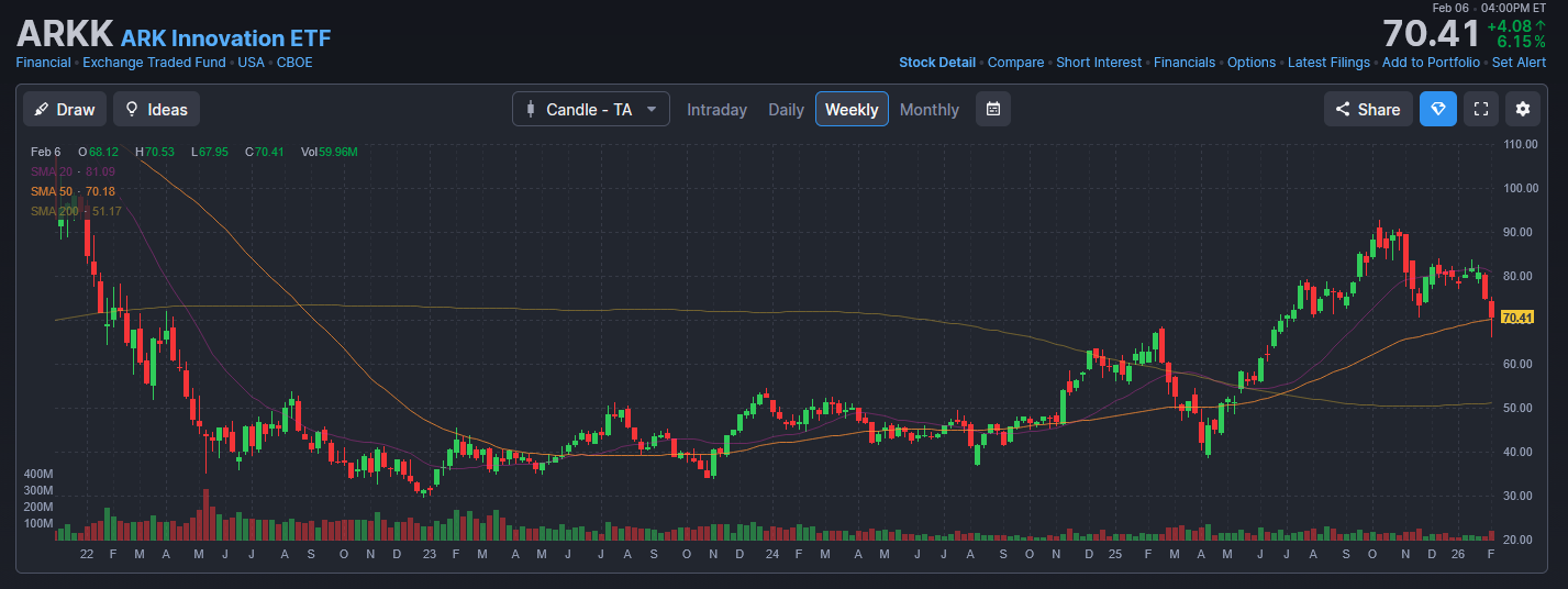 >>61819122arkk weekly chart. innovation and growth used to be the hottest corner of the market, 5 years ago before the ai boom at least. i still own a lot of this stuff. looks like a buying opportunity. komp is like diet arkk and there are other clone funds that i also own, ginn, xt and some others. basically it's a smid cap growth strategy. a lot of this complex is still well off it's highs made in 2020, particularly biotech, now also crypto. interesting how komp is at the 20 week memeline and arkk at the 50, imagine if we go down more the next buying opportunity is at the 50 week for komp, 200 week for arkk. i think the selloff is over, think arkk is the thing to buy now.