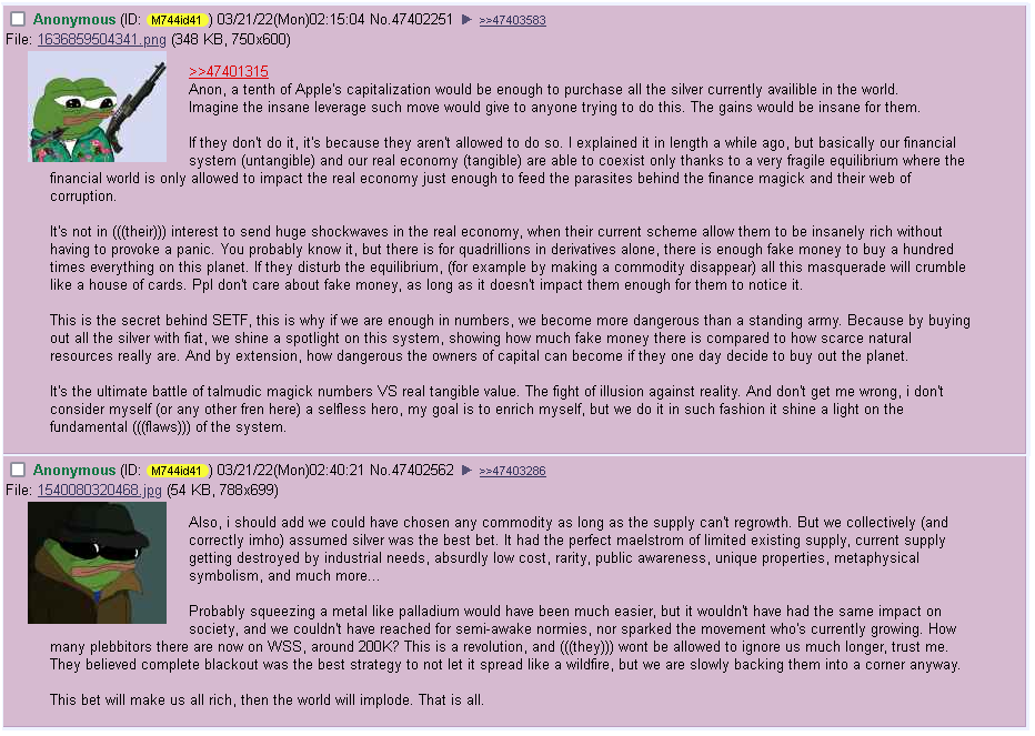 >>61818622They declare "force majeure", halt trading and cash settle traders on the notional values of their positions to get people to shut up and go away.People who get cash settled out will likely move their money into other commodities like gold/copper/platinum etc, but the same systemic issues in the silver market are also prevalent in every other commodity, so the issue will spread into all of the other metals, and you'll begin to see all of the other commodities begin to melt up, including things like corn/beef/oil etc.I assume the federal reserve would need to step in at some point in order to facilitate all of the cash settlement because it's a lot of money.While this is happening you'll see the prices spike on other exchanges like LBMA/SHFE until they eventually run out (they have similarly empty vaults so this won't last for long), and then as they're printing infinite money to solve the problem you'll see basically all commodity prices begin to skyrocket and by that time people will seriously be talking about hyperinflation.It should also be noted that a lot of bullion dealers use the COMEX to hedge, but so do a lot of farmers/ranchers, so the major hedging mechanism for nearly every major important industry will go away and you'll begin to see widespread market panic since no one will know how much things are supposed to cost anymore, and you'll see a lot of geopolitical drama as nations begin to enact more protectionist economic/monetary policies and fight over resources.Countries that don't produce any commodities or have any major industries are going to have a bad time. It's not going to be fun, but it might be funny.https://youtu.be/RHwTa9sgryM