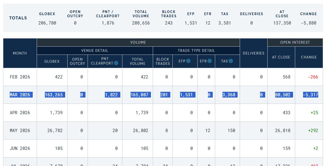 >>61820508>how many people do you think will be able to pay contract in full to receive physical at current prices? 76,091 contracts (~390 million oz) are currently scheduled for delivery in march. You can see the numbers here: https://www.cmegroup.com/markets/metals/precious/silver.volume.htmlIn January nearly 100% of the contracts took delivery. For what it's worth, the free float is only about 100 million ounces.
