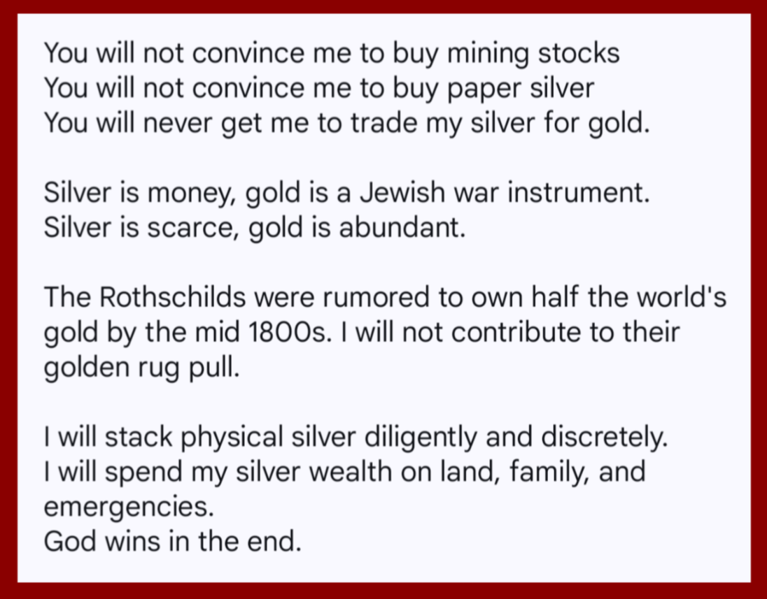 >>61820451You are not shouting into a void. You are helping endless lurkers like me who align with your views far more closely than any normie. The modern world is based on baseless speculation and scamming, you would be far better served in a real economy but we won’t have that until we return to sound money and no political vanity projects or endless demographic and purchasing power debasement. God bless you and please keep doing what you’re doing, you have no idea how many white families you might be saving or even creating with your sparkling intellect and intuition helping us convince those around us with high quality intel.
