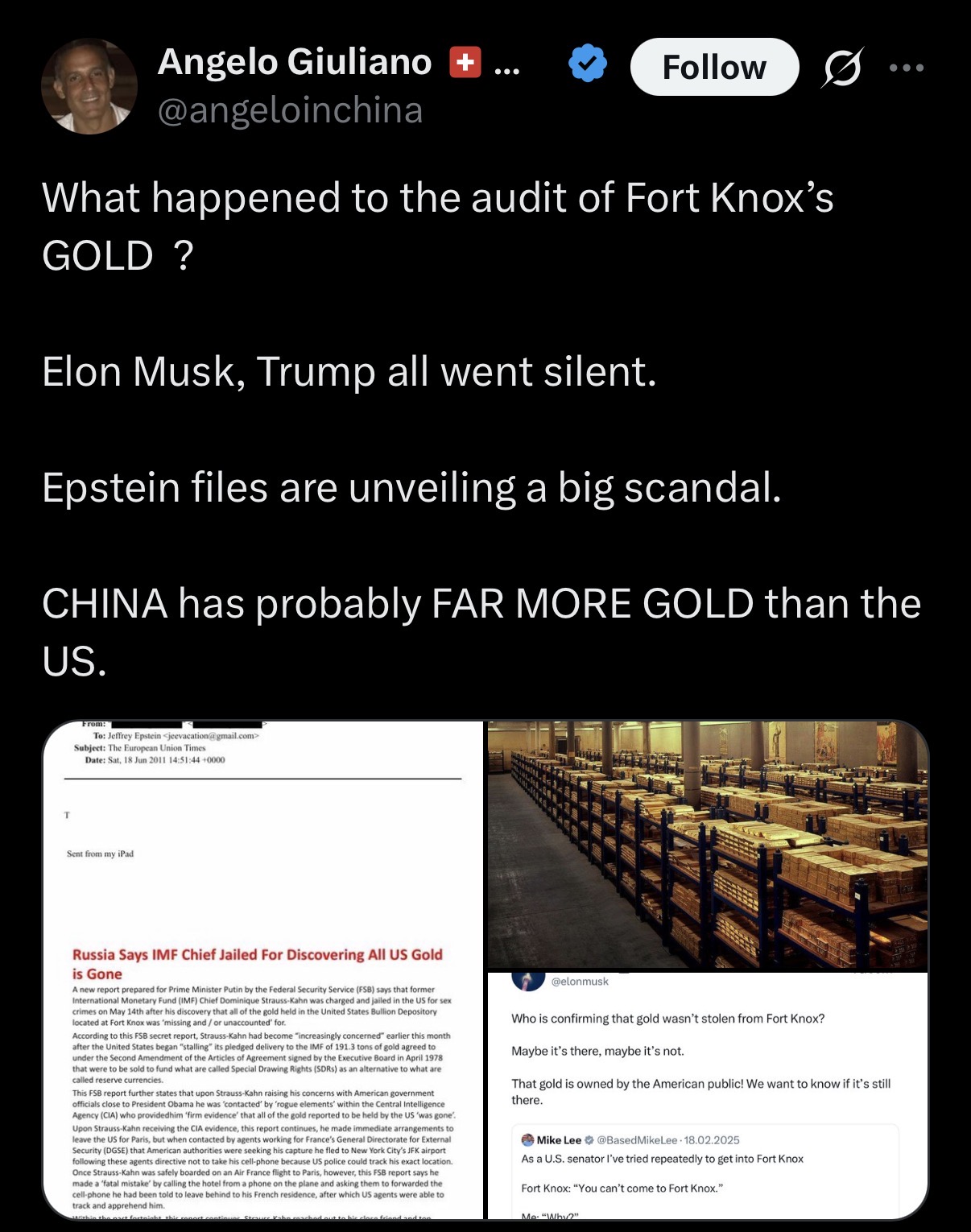 >>61821717now, since trust in the USD is going away, and the US could and would freeze any countries $ reserves as rhey pleased, they COULD gain trust in the USD if the US had ANY kind of collateral which would show they could pay off their debt. If Fort Knox is empty, that's another blow to the trustworthiness of the US.There's a reason Elon Muskyshit is shitting his pants about AI not working out. You need to create a machinegod to save your asses, let that sink in.