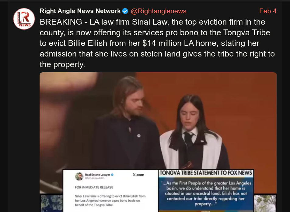 Posting this as a warning to any stackers. NEVER make any land acknowledgements.https://x.com/Rightanglenews/status/2019080223212318739>I never thought the leopards would eat MY face, sobbed the lady who acknowledged that the leopards had the right to eat her face.