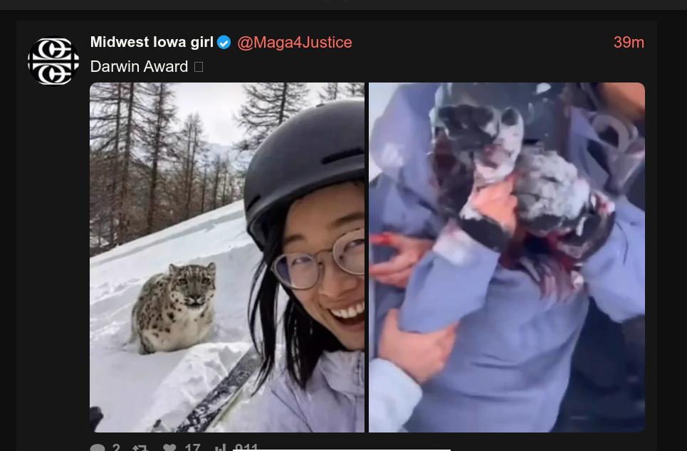 >>61822344Here's the real life version.>I never thought the snow leopard would eat MY face, sobs the woman who took the selfie with the snow leopard.