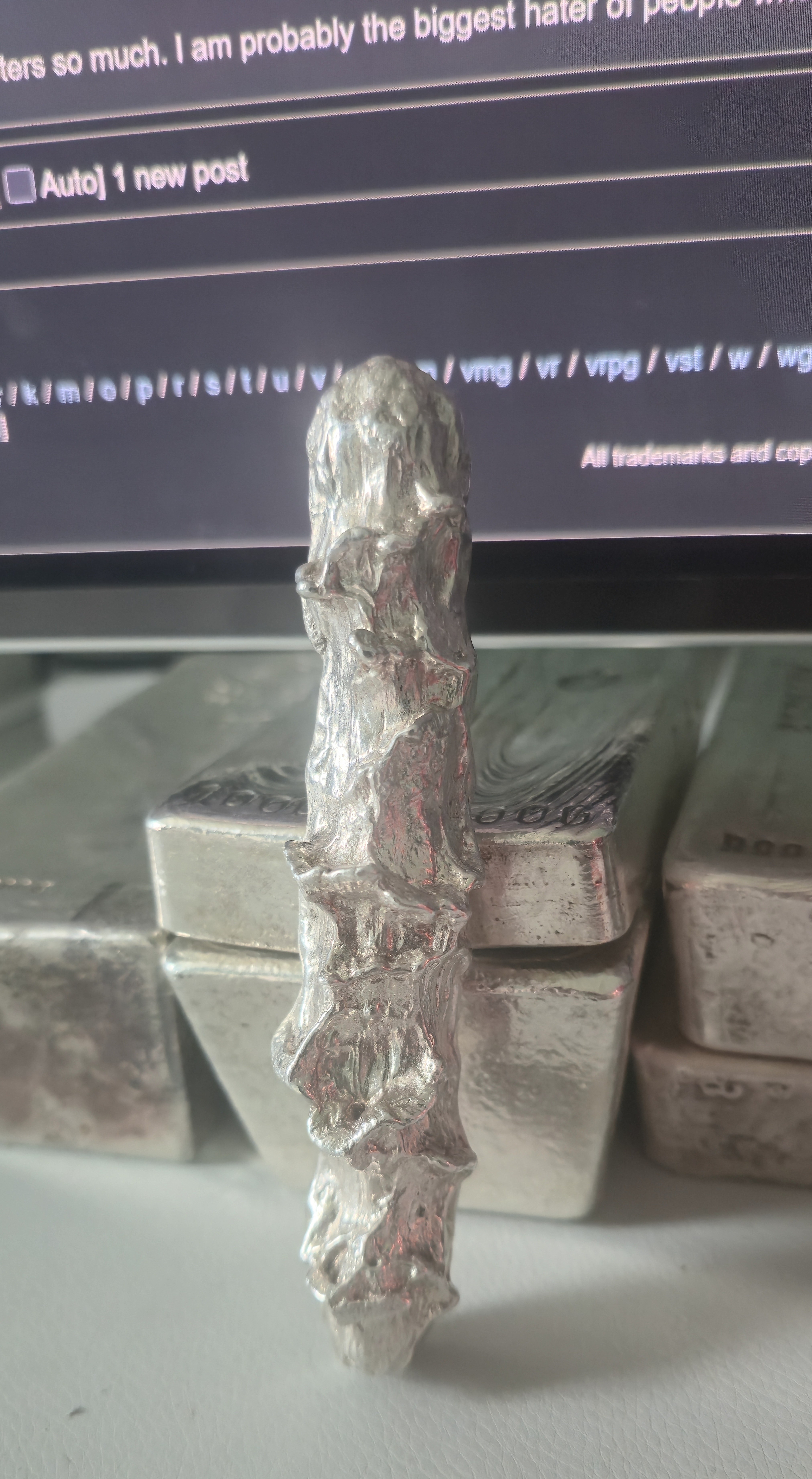 >>61822644>Still cool tho. Better than alot of unnatural images available imoIt's one of my favourites that I keep on my desk 24/7, along with some heavy bars I like to hold from time to time to remind me of why I stack.>>61822646You're the anon I originally wanted to reply to, that's a great coin, I wish more silver had the atomic symbol on it.Here's a pic from the guy I commissioned my bars from, I asked him for a 100oz as well, but he didn't have the equipment for it. This was back in 2022, his premiums are insane now.