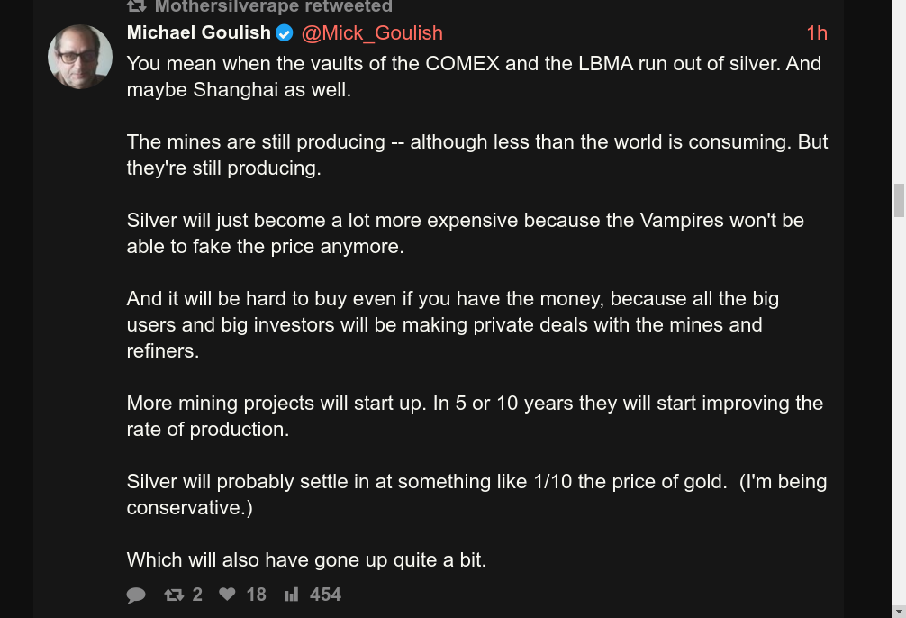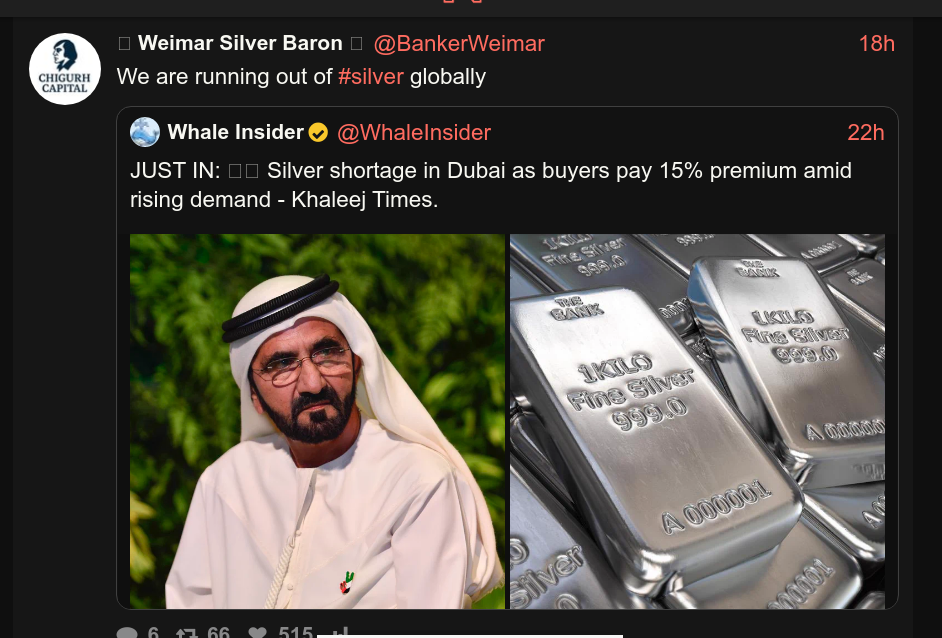 >>61823642>Silver prices will always crash back down.This time is different. In 1980 and in 2011 there was a couple of billion ounces in vaults available for deliver.Today, COMEX, the LBMA and even the Chinese SGE/SHFE vaults are rapidly running dry. At worst, 3 weeks. At best until March.When the vaults run dry of available metal, expect silver go gap up to $200+ USD per ounce.