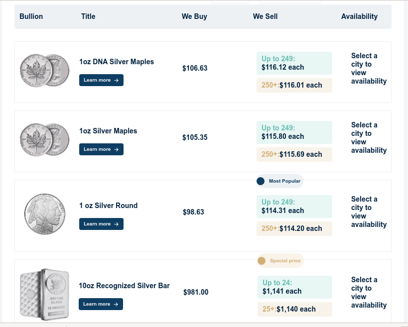 >>61823530Silver has a well defined resale price nearly everywhere. If you go to the only coin shop in a small town and say:>How much will you give me for this?You should almost expect to get fucked. Many reputable places have online prices for buy backs.Picrel, We buy, we sell, but that begs the question, why are you selling? The whole point of stacking is to hold it long enough for it to appreciate. Unless you spent all your money and had an emergency, then we recommend that you use the silver as 100% collateral for a loan from a friend or family rather than take the loss in buyback commission and then lose the appreciation as the silver goes up in price.We've been buying silver for over a decade and have never sold even a gram. We have given away some silver as gifts, including half a dozen pieces this Christmas to relatives.