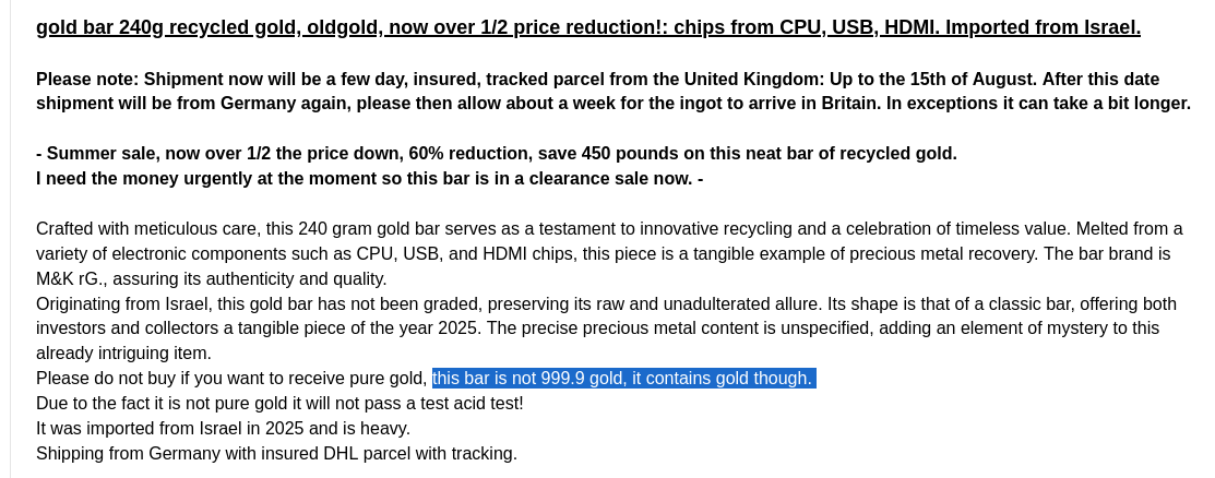 >>61824047interstengly enough, i found a few "recycled" gold bars on ebay from people. always pondered if i should buy one and have a refinery tell me the purity. On the other hand, the seller couldve done that aswell so by not telling it reeks of scam