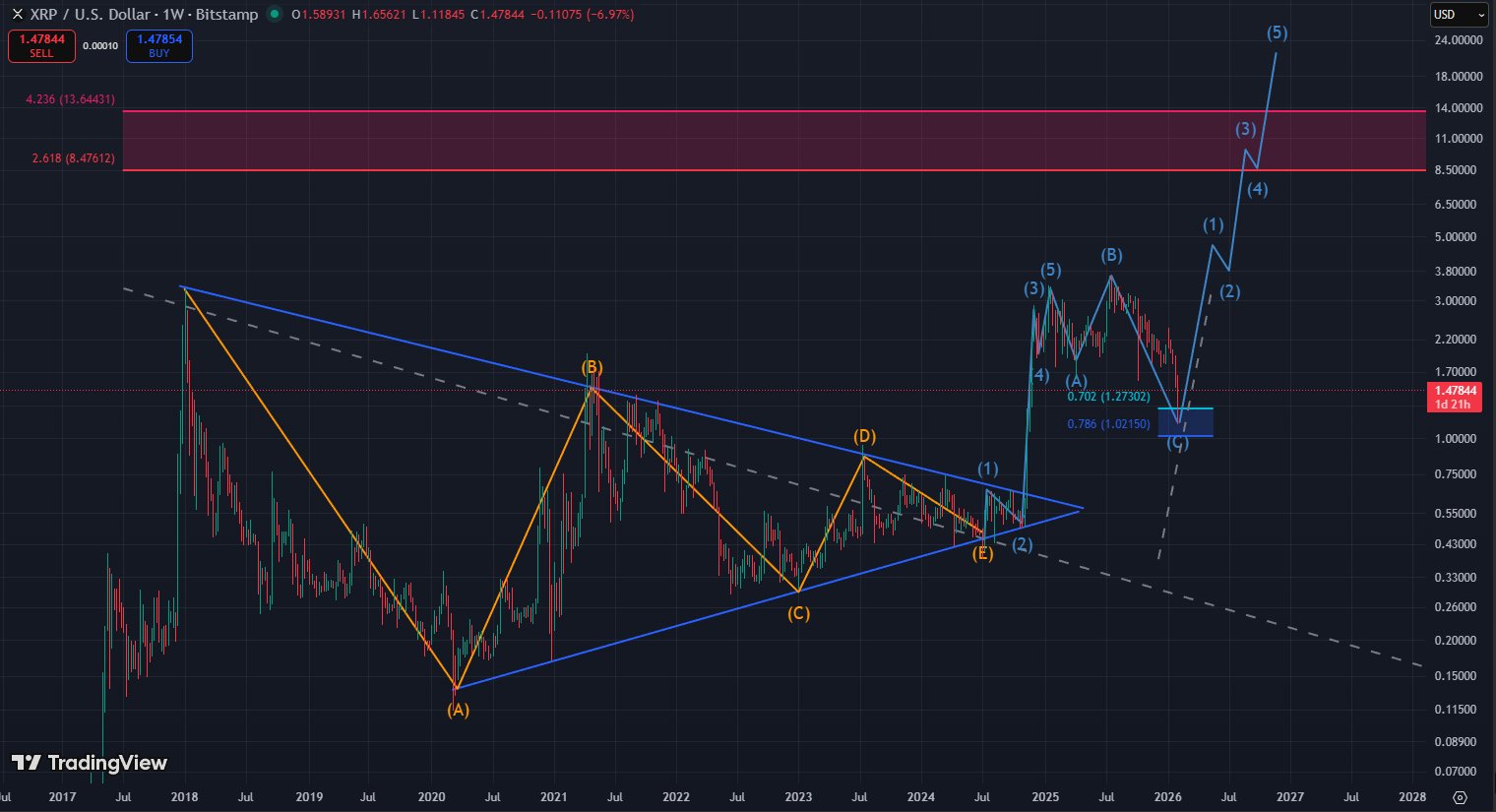 Dear XRP Army, I am no Elliot wave or Fibonacci expert, but I have been staring at these charts and absorbing information and perspectives from various traders and investors online for half a decade now. On the macro scale, big picture, XRP looks absolutely ready to blast into price discovery at any moment. We experienced a 7 year contracting triangle accumulation structure followed by an explosive 5 wave breakout to test our all time highs (Macro wave 1). Now we have been in an ABC correct/reaccumulation for over a year that has resulted in mass fear an capitulation down to a .702-.786 retrace. This has been nothing but a macro wave 2. We are now positioned to at any moment begin our macro 3rd wave (which is typically the largest wave from my understanding) into price discovery. Now this could be right around the corner or we could take awhile longer to work out this correction and begin our next impulse, it's anyone's best guess.But be prepared, because when this correction resolves, which it 100% will, it will result in XRP moving quickly and violently to higher prices. Just like our wave 1 did. Our 2.618 extension sits at $8.47 and our 4.236 extension is at $13.64. These are both good targets to aim for but I expect with the length of time that XRP has consolidated and built out this structure we could see it reach far beyond these targets. Please don't forget, XRP is the only crypto asset with complete regulatory clarity in the U.S. and Ripple has continued to silently build out the infrastructure required to foster global adoption when the time is right to "Flip the switch"That lawsuit happened for a reason.Enjoy the show