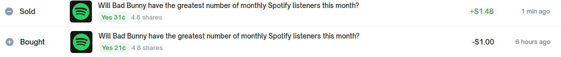>decide to give polymarket a try for the fun of it>hear 10 hours late that badbunny's spotify has increased 400% in the US>still had time to buy the dip>sell it for 1.5x after 6 hoursThis shit is scary. I'm already having thoughts of what if I put in actual money into this shit