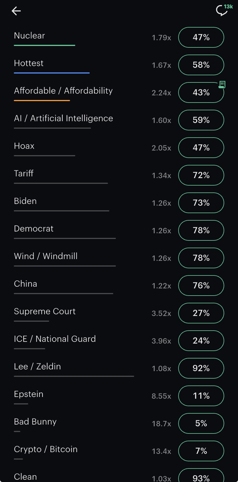>>61836296The mention markets are legitimately fun.sometimes they’re predictable. Yesterday Bernie Sanders had a 1 hour interview on MSNBC. Leading up to it, “healthcare” was selling for $0.52. Does anyone think the chances of Bernie Sanders bringing up healthcare on a long interview in MSNBC are less than 100%? I did lose on him not saying “trump”; it was at ~90% during the entire interview and at like 58 minutes I put $2 down and as soon as I confined it the old commie talked about trump. The President is speaking to a coal lobbying group today after they present him with the “Champion of Coal” award. These are the mentions that you can gamble and trade on. I’m only holding “affordable.” Check Kalshi leading up to and during the event and watch as prices rise and fall. It can be a lot of fun.