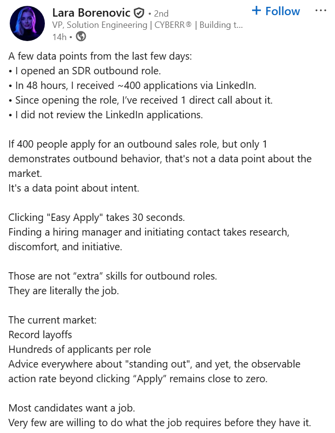 >>61830366Essentially, she posted a job on LinkedIn and ignored 400 people who used Easy Apply, only considering the one who called her directly because it was for an outbound role.