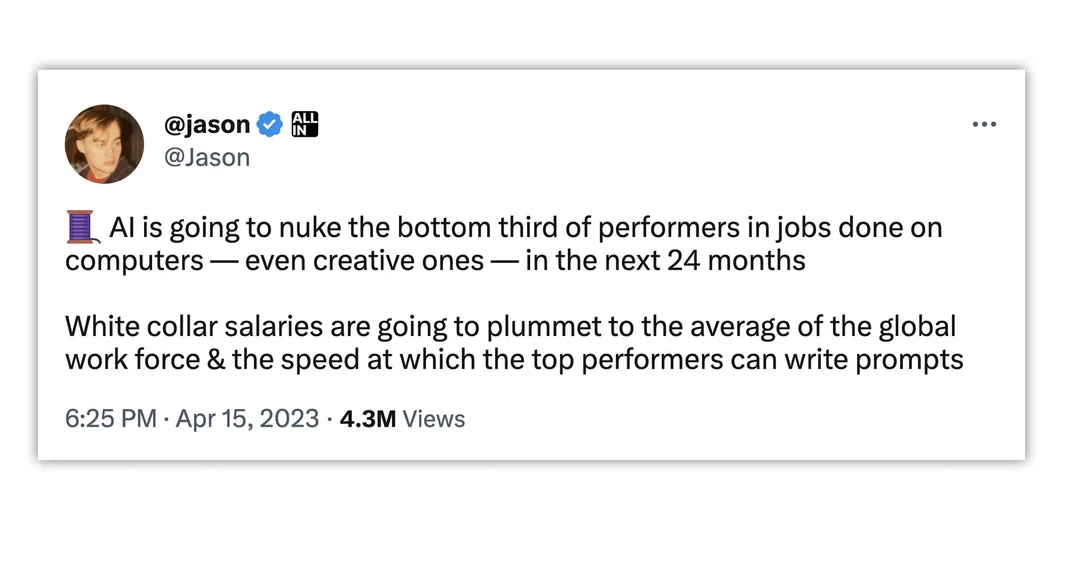 If this were true, the first companies to fire the majority of their workers would be the tech companies who are experts at using the AI.
