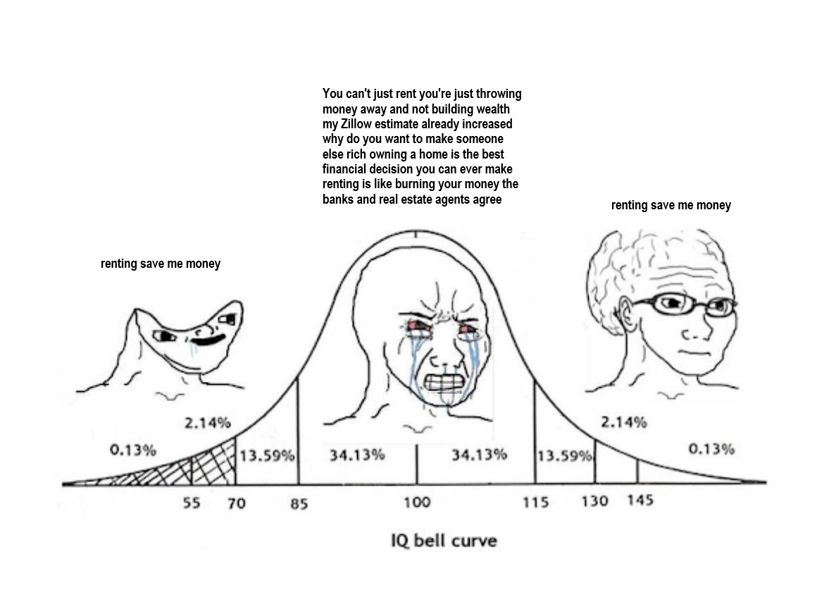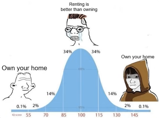 >>61879449The ol' rent vs own IQ test. This really separates the retards from the financial literates. It's financially optimal to rent in most circumstances, including today's. If you can't arrive at that conclusion yourself, it's time to hit the books because we can't think for you.