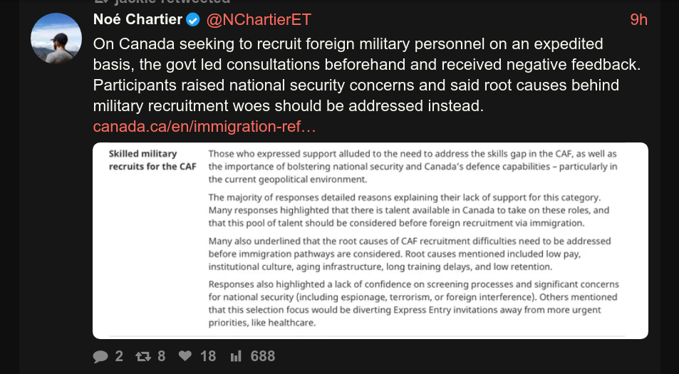 >>61881589>that's what all the imported shitums are for. Service guarantees citizenship after all.Canada is offering expedited citizenship for migrants who want to join the Canadian military.https://x.com/NChartierET/status/2024857729664233557They want jannisaries who will put the boot on Canadian's throats who have no loyalties or connections to Canadians.