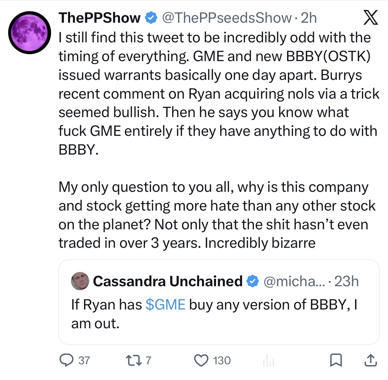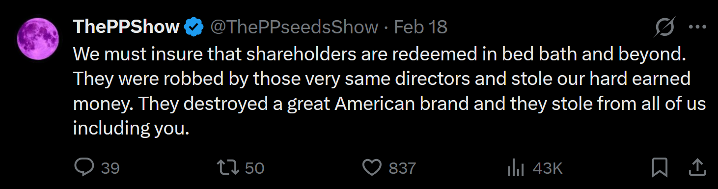 Damn why do people care so much about “destroying” the bbbyq thesis over 3 years later? Do people forget that RC tried buying the company, then gained creditor status, and was close to pulte who was close to the bbbyq community? Also Larry Cheng going onto theppshow podcast was the most obvious head nod but shills bark and howl just at the mention of it. Also isn’t it curious when burry posts something bullish it’s silence, when it’s bearish the shills push it harder than they ever have?Why would the same company the CEO tried buying, and is a creditor for, have it’s unique permanent cusip-6 used by the warrants of a different publicly readable security for the company who owns tZero and is famous for battling naked shorts decades ago, just as rc is battling them now? Nothing is as clear as the cusip-6 conundrum, except maybe gasparino and shitfu ruining their careers over a “dead” towel store. Sad ha!