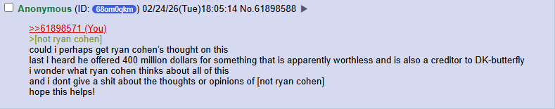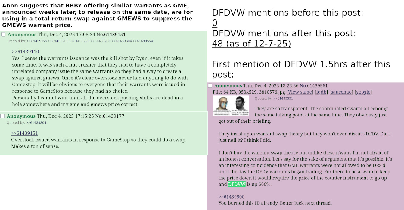 Seems likely that they just confessed to what they were doing by projecting it onto the bathbaggies because in their hubris they didn't think anyone would figure it out, and then Morrowposter was dunking on them an hour later. Wake me up when someone makes a prediction about the price action for the bathwarrants the way the DFDVW warrant price has been predicted accurately with C+35 cycles from the day GME-WT began trading. It's also weird how the brokers wouldn't let anyone DRS the GME warrants until the day DFDVW began trading. There's just a ton of evidence for one and no evidence for the other, but they demand you take them seriously even when they lie about it over and over again. >>61907680That was hilarious. Then they all came back at the same time and pretended to be busy with their lives on a Friday night. >>61907684Is this the part where I accuse you of using a VPN to ID hop? You people use the "everyone is the same person" psyop even when it's retarded. You accused that anon of being all the same people in this thread, on Twitter, and on Reddit to try to discredit the organic discussion of that theory. It's just not credible at all and it's pathetic that you keep trying to claim it.
