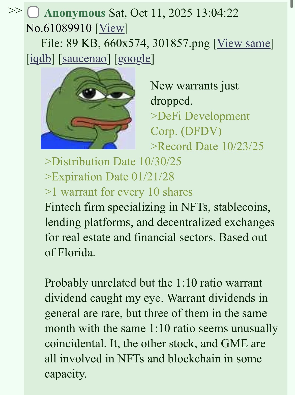 >>61907960Here >>61902769is evidence that that anons “meme” isn’t true as it confirms someone bought up defi warrants and their conspicuous timing back in October. Literally kys. You’re lucky I can’t post a smug picture.