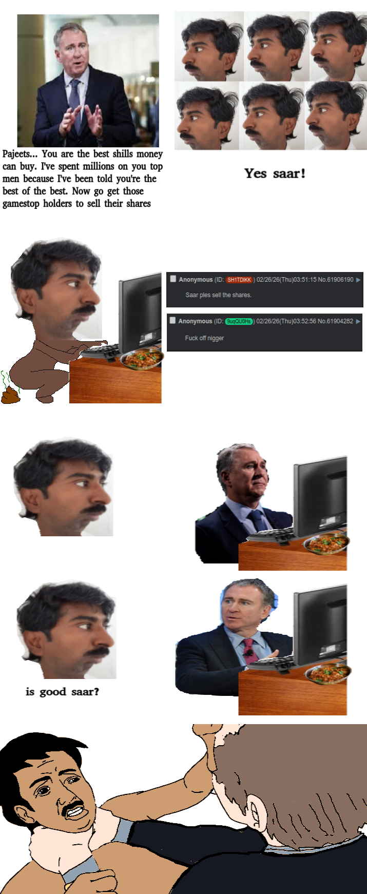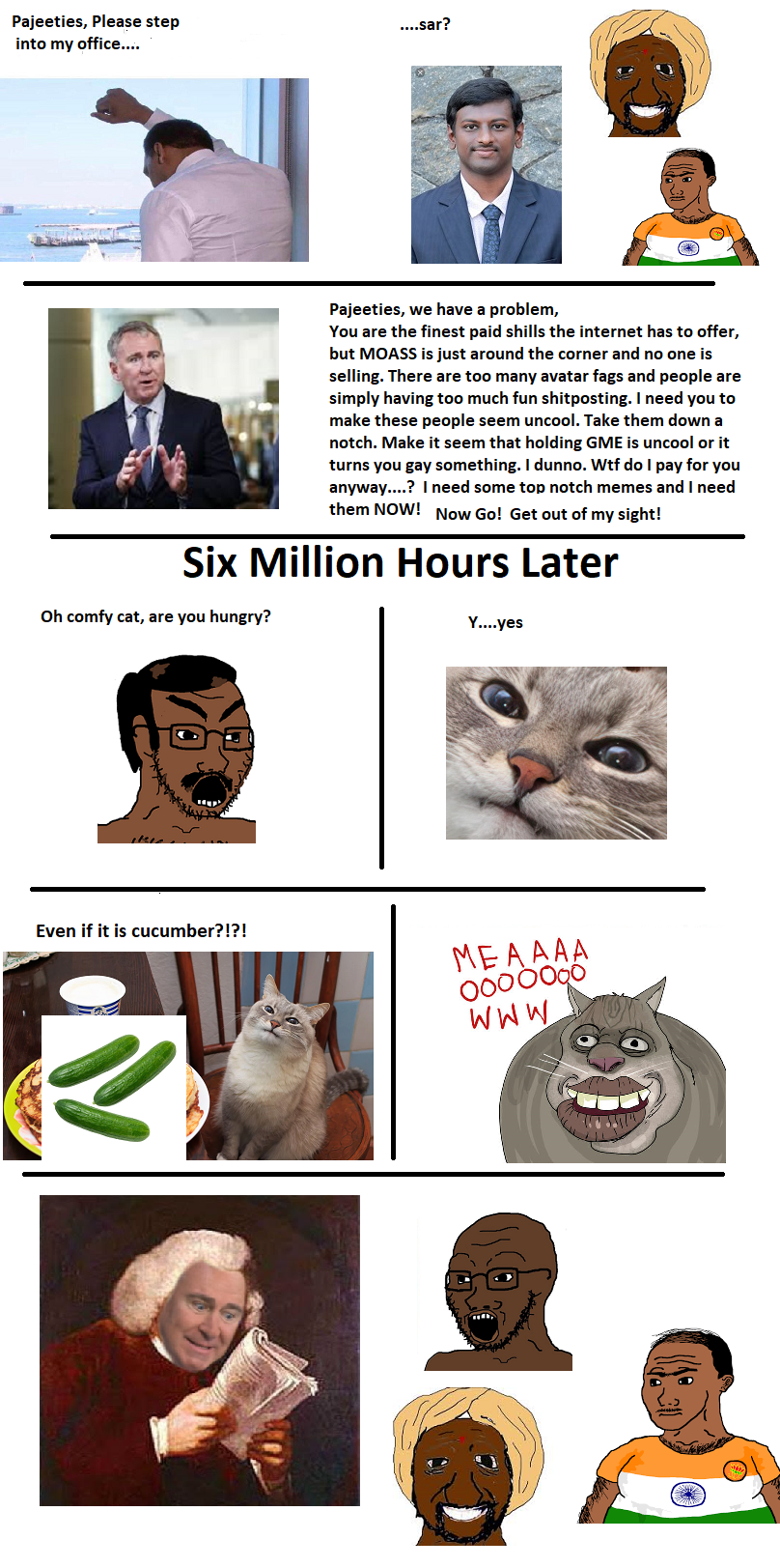 >Force degenerate silly meme in /GME/ threads>Manufacture fake scandal with google search in usual suspect locations for term unique to /GME/ thread>Two basedjaks pointing at TSSR.meme>Successfully create enduring intrathread thoughtform>Append thoughtform to problem subjects to discredit without rational evaluationI’ll give it to you it’s a 7/10 as far as psyops go and probably the most effective one to date but that doesn’t make it or you any less gay. >Pivot back to Twitter faggotCan we just skip to the part where you faggots spam the thread to make it unusable?