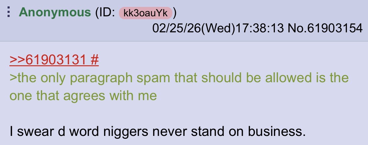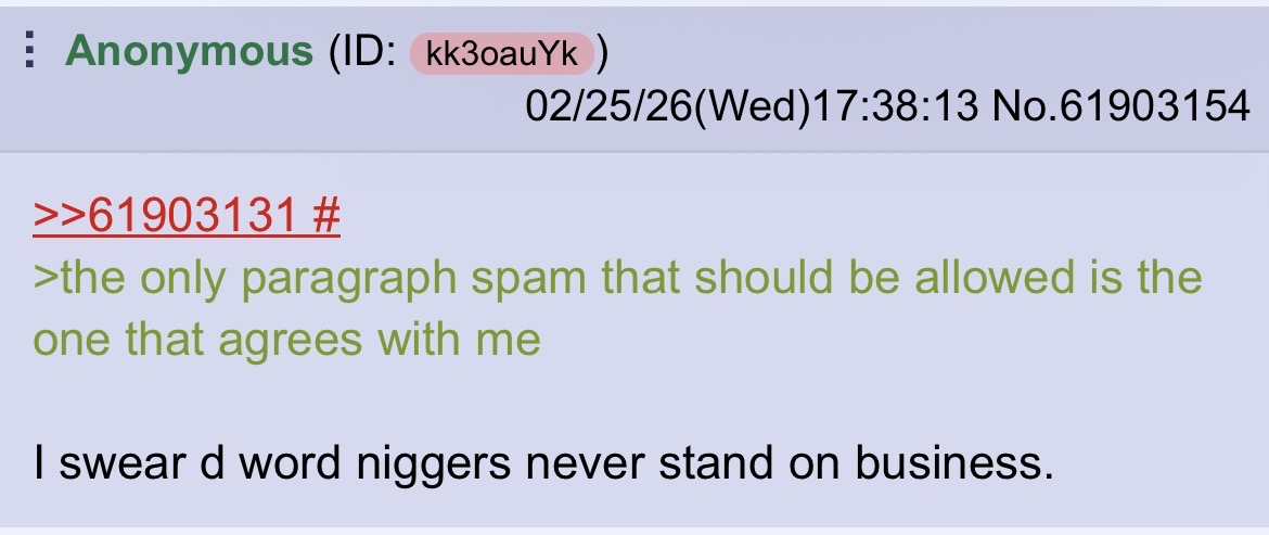 >everybody I disagree with is the same person It’s all so tiring. All you’re doing is emboldening and confirming my and the other anons suspicions that your are in fact a d word nigger.