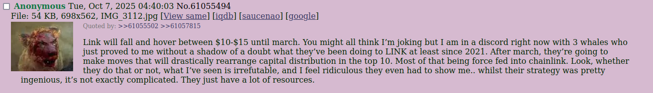 >>61901638>>61900759holy shit Link cuckolds really believe the predictions made by an anonymous shitposter on biz. This is what 6 years of abysmal price performance does