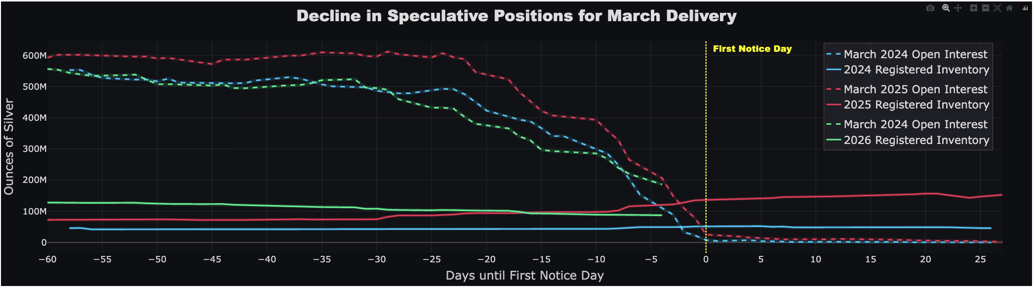 copied from my comex watch threadLATEST UPDATE AS OF WEDNESDAY MORNING2 days until first notice dayregistered inventory declined by 1,018,762 ounces. currently 87,172,296 ounces are available to meet demand. open interest dropping sharply as expected. 14,196 march contracts were closed, 5,350 rolled into may. remaining open interest is 114,830,000 ounces. that leaves the gap at 27.7 million ounces. this gap will certainly be closed over the next two days and oi will slide below registered just in time. this means march will (likely) be the first month of the year where deliveries will be lower in 2026 than they were in 2025. quite irregular especially for a major month when the two previous minor months unexpectedly saw blowout delivery quantity. even with march 2026 deliveries likely less than 80m ounces, registered inventory at comex is likely to be almost completely depleted at the end of the month. it's unclear how they will manage to avoid soft default in the second quarter.