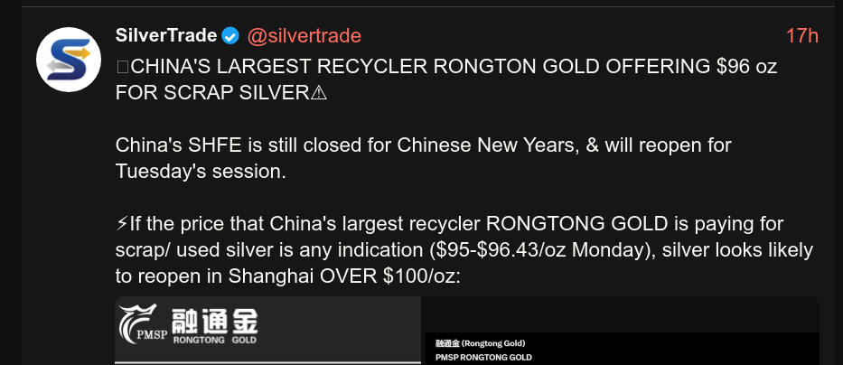 >>61901445>Because an industrial actor can be persuaded to accept later delivery in exchange for hefty compensationUnless they need the physical for immediate production. Shutting down the production line because one has no raw materials is to be avoided at almost any cost.And yes, the short term solution to a silver shortage is much higher prices. Plenty of boomers and even younger guys will sell at least silver for $200+/oz, particularly if it shrinks the GSR to 30 or less. $250 silver takes the GSR to 20:1 at current gold prices.
