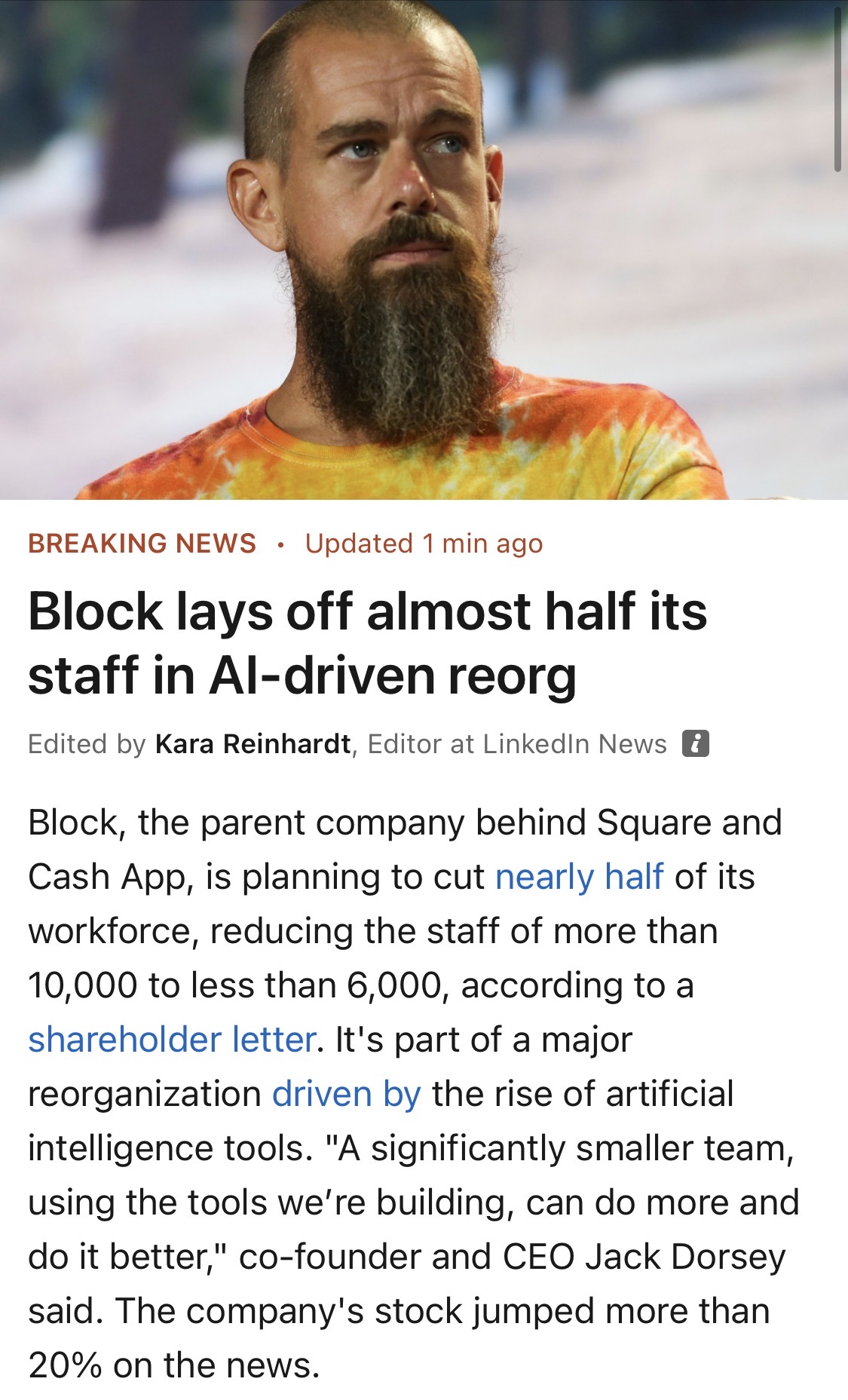 When Elon took over Twitter from Jack he was easily able to cut 80% of the workforce without major issues, and that was before AI. Maybe Jack just hires too many people and he's using AI as excuse because he doesn't want to admit Elon was right.