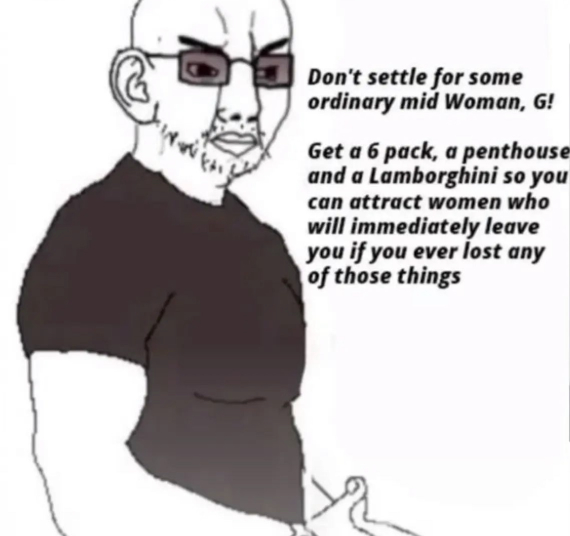 >>61915592>talk to actual womenI am married to a woman and I’d rather not speak to one desu. Complete meme.