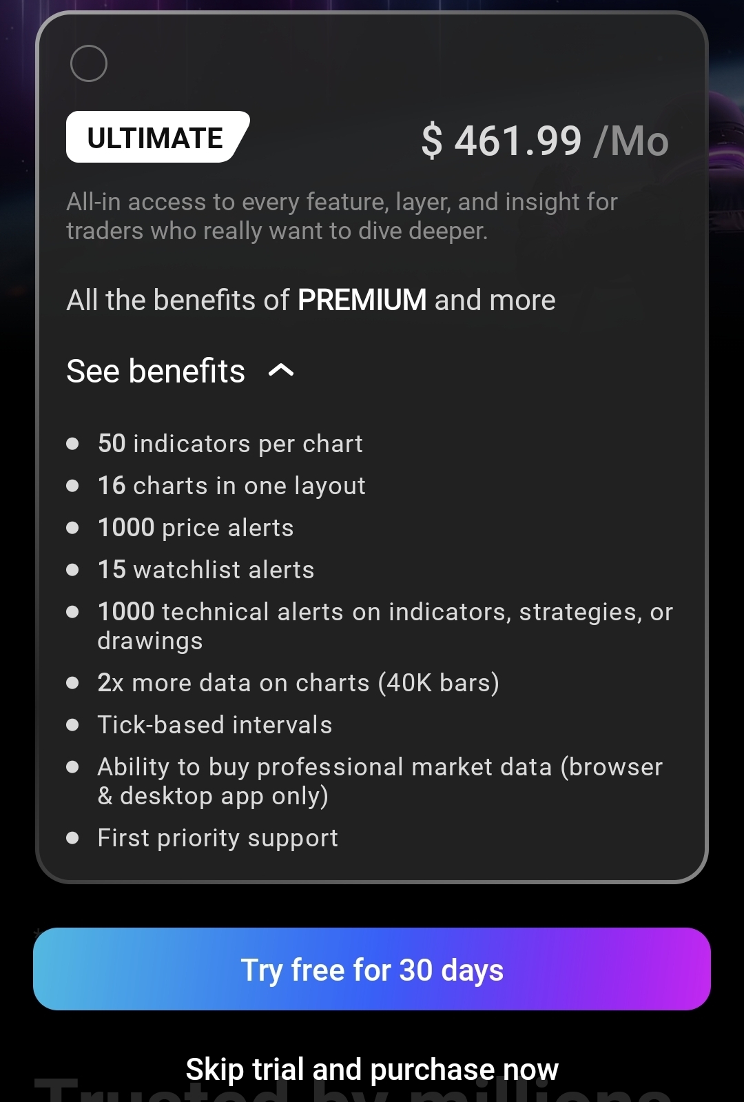 >>61918474you need pro to see 1 second charts, which costs 60/mo, but if you buy on holdays is only like 216/yr instead of 720. the ultimate tier is to see tick charts, which are very cool, but certainly not worth it for someone who makes this thread.