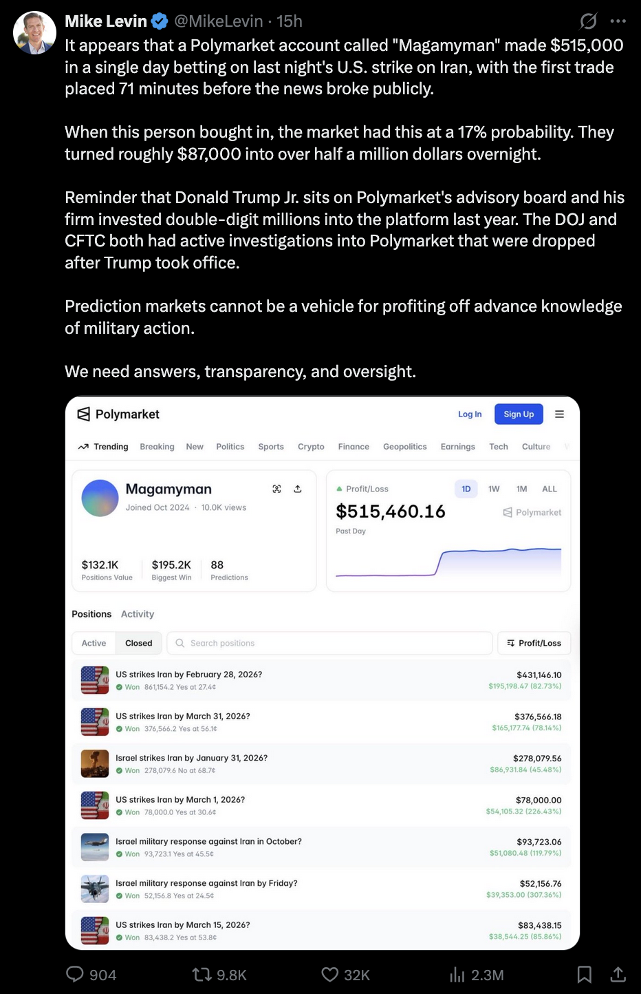 Someone had to be on the other side of that gamble for the insider to scoop all that money. Cryptards deserve to lose all their monopoly money if they're going to put (collectively) 100s of millions of dollars on either side of predictions of real world events determined by decisions they aren't party to