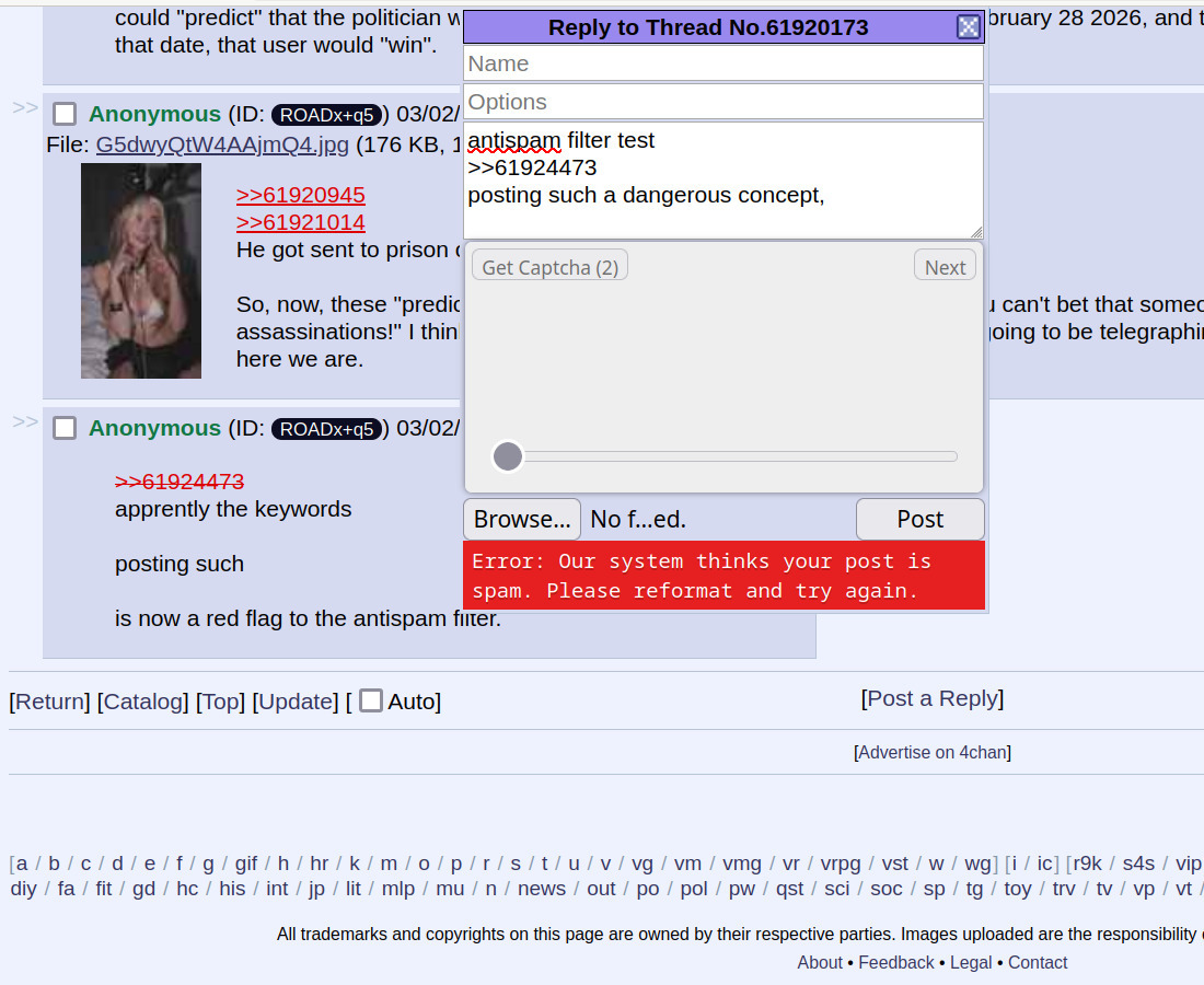 antispam filter test>>61924473Apparently the keywords> poxsting suxch a danxgerous conxcept,(minus the x's) are now part of the antispam filter.