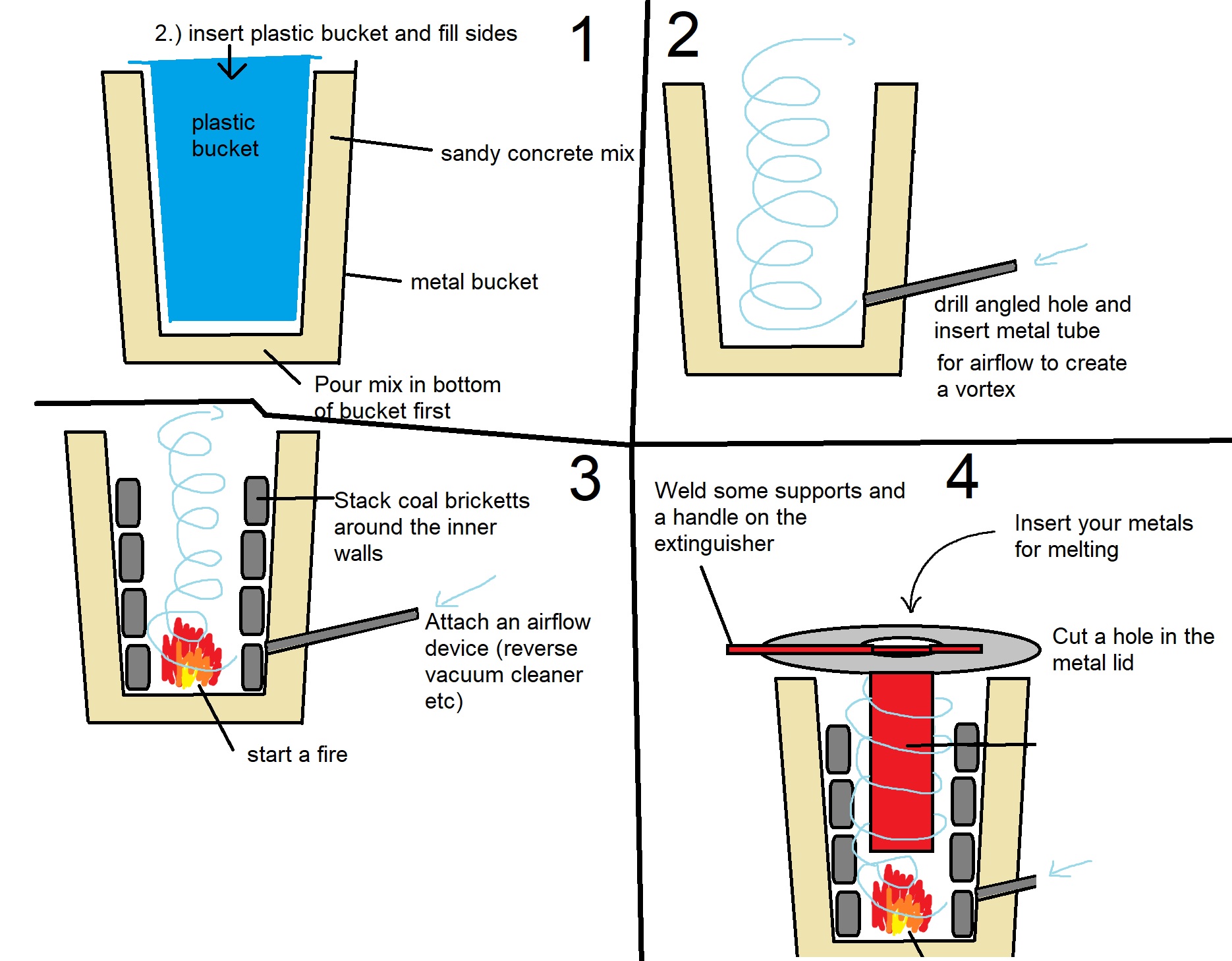 >>61921379This is the design of my can smelterIt can get up to ~2000'cAll you need;Metal bucket with lidSmaller plastic bucketSandConcrete/plasterUsed fire extinguiserSome Rio steel rodA metal pipe (the longer it is, the less hot it will get)A pumped air source (reverse vacuum, blower etc)Coal brickettes