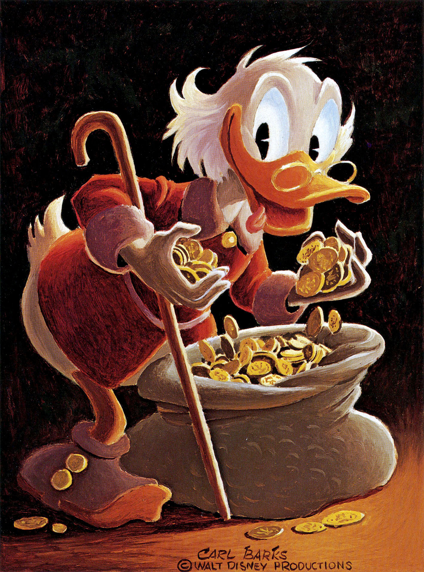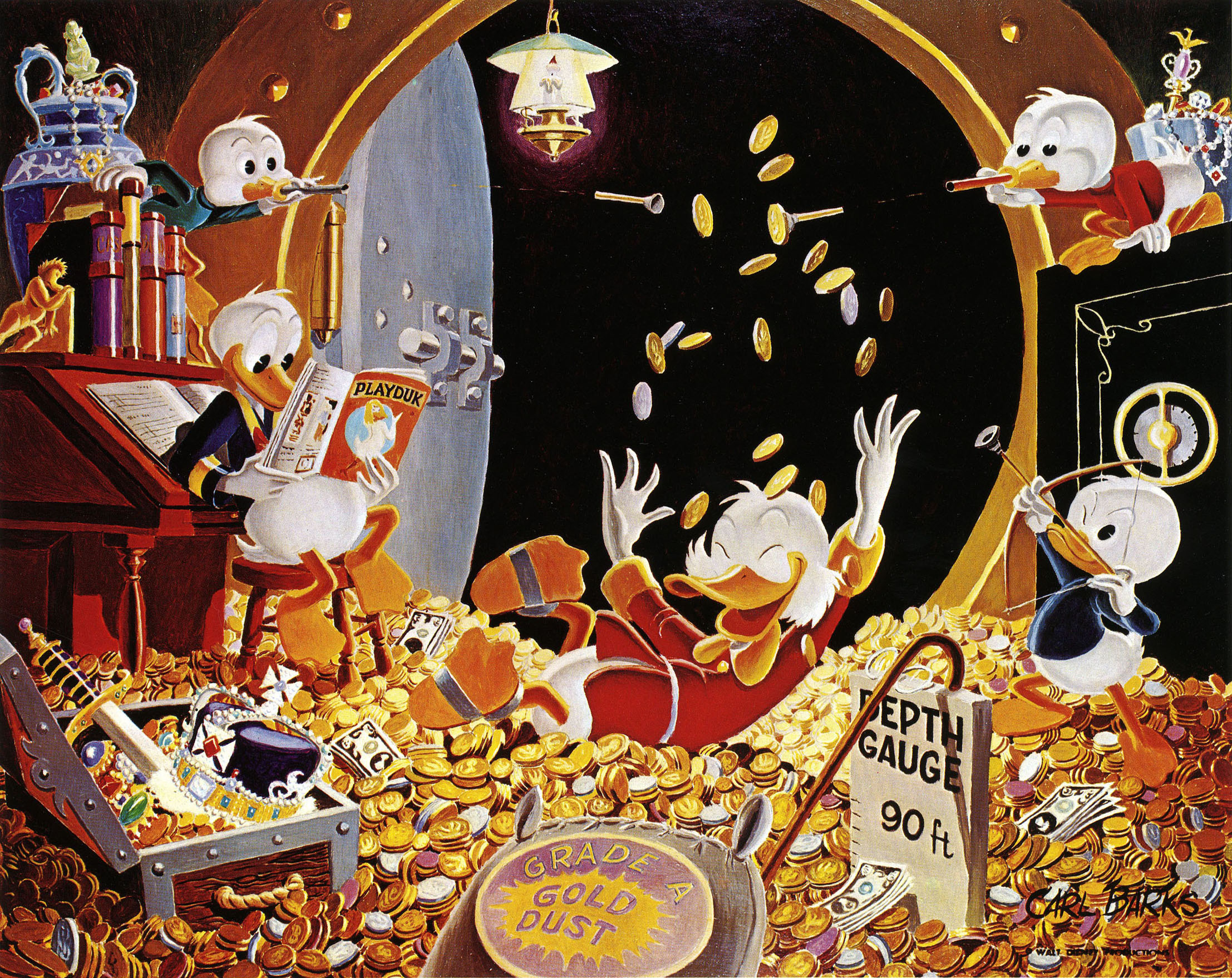 >>61921586They are Oil Paintings by Carl Barks one of the most popualar Duck comic artist Based on some scenes from the storys he wrote over the yearsHe inveted Scrooge,Gyro,Magica,Gladstone etc for Disney but no one outside the US read his comics which is bizare because in Europe they are popular to this day and you can find them in every bookstoreusually he drew Adventuire storys where the Ducks go to some bizare country and find an old mythical treasure like the golden vlies or an old Inca land where everything is squareHe also regulary trys to safe a few pennies by buying old used up cannons or other military equipment for self defenseHe has a cannon all the way from queen victoria for example with gunpowder because he got it for cheap in order to deter intrudersThe nephews are having fun with a mock up procession for scrooges first Dime which was useles to him because its an American coin and he grew up in scotland and he took it as a keepsake to remember that everyone is out there to swindle him and that if he wants to make it in the world he has to be the thoughest and most cunning person out there