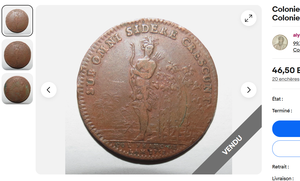 night slurp, i didn't expect to win this one for below 80e, very happy!>early coinage token for the US french colonies, featuring an indian savage and in latin "they spawn below any star", 1751
