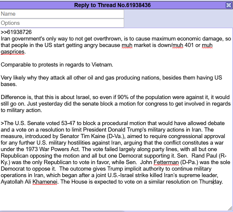 >>61938747>If the (remaining) top leadership is smart they should be packing their bags to move to russia as soon as possibleyeah I wouldn't even try the "surrender to get immunity thing" or "I'll just hide out in my house and not do any military things ACK"CIA is hunting for people, they literally killed khamani in his fucking houseNowhere is safe in iran right now.I'd be getting the fuck out of dodge.>Difference is, that this is about Israel, so even if 90% of the population were against it, it would still go on.yep. the dems are pretending to be against it as a show because orange man bad, but that's just nonsense.the usual energy just isn't there. Really half hearted "war protest"