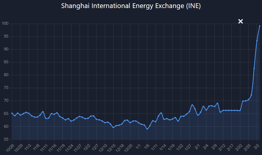 China's Shanghai INE crude futures have surged to $98.5 per barrel